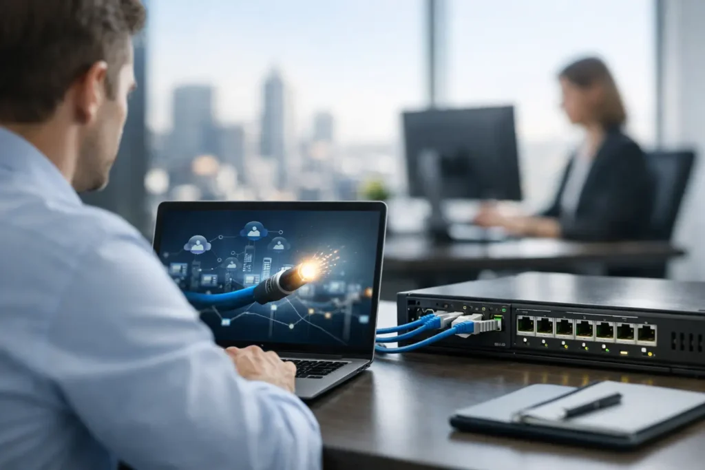 De nada adianta um link potente se a sua rede interna falha. Projetamos e executamos toda a infraestrutura de rede da sua empresa, desde o cabeamento estruturado até a gestão de switches e roteadores.